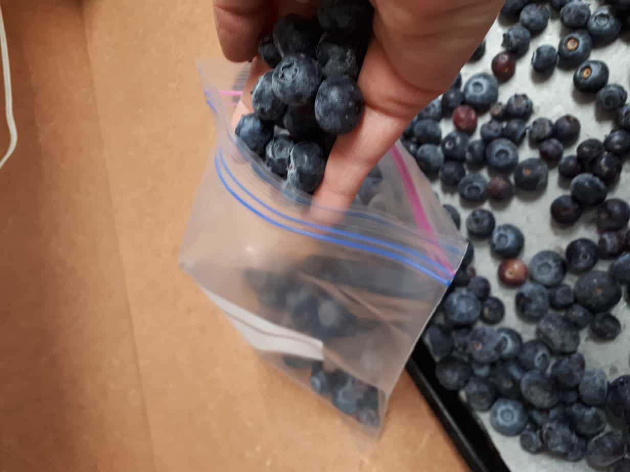 Now that we have our blueberries separated we are going to place them into freezer bags. I only have a few so I just used my hands to scoop them into the freezer bags. If you have lots then you can place the frozen berries into a bowl and use a one cup measuring spoon to scoop them into freezer bags.
